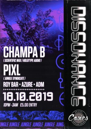 The last dance of 2019 from the Dissonance crew…and what a year it’s been – Four, amen heavy, late night, bass driven instalments serving up the best in underground jungle/drum & bass. This time is no different as we present to you Holotype Audio’s co-founder and regular badman, CHAMPA B >> If you like it heavy, you know whats coming…