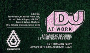 On Wednesday April 18th, join us in WORK bar for Spearheadโs 13th birthday party warm up! Come hang out with the label’s crew and the artists: Technimatic, Pola & Bryson, Dexcell & more!