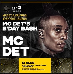 Mc Det & Afro Soul London invites you to his Birthday Bash, with there DJ and MC Friends @ E1 on the night expect some sic vibes with a line up to get everyone skankin & stompin.