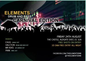 Elements DNB returns to The Castle on Friday 24h August 2018 for the Carnival Weekend! Expect the full spectrum of Drum and Bass, Jungle and UK Garage to warm you up for the Bank Holiday.