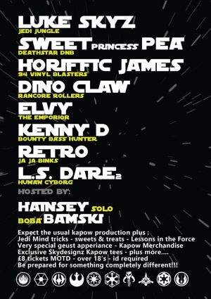 After another success at Work Bar, KAPOW! Return with another Star Wars Themed night of Music n Madness, digging deep for the Original Rave Sound!!