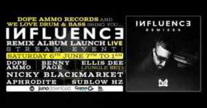 This Saturday! Get ready, because we are going LIVE for the release ofย Dope Ammo‘s brand new album ” Influence Remixes ” With live sets from Benny Page, Nicky Blackmarket, Dope Ammo, Sublow Hz, Aphrodite & Ellis Dee!ย ![]()