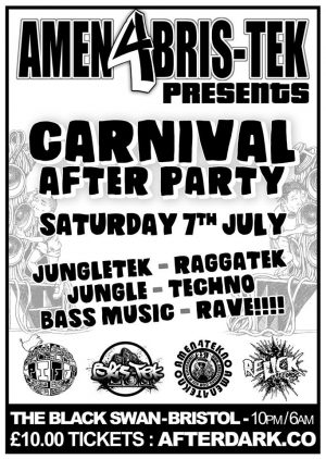 Amen 4 Tekno & Bris-Tek join forces again to bring you a Carnival afterparty full of rigs, Tek, Jungle, Tekno and lots of smiley faces.